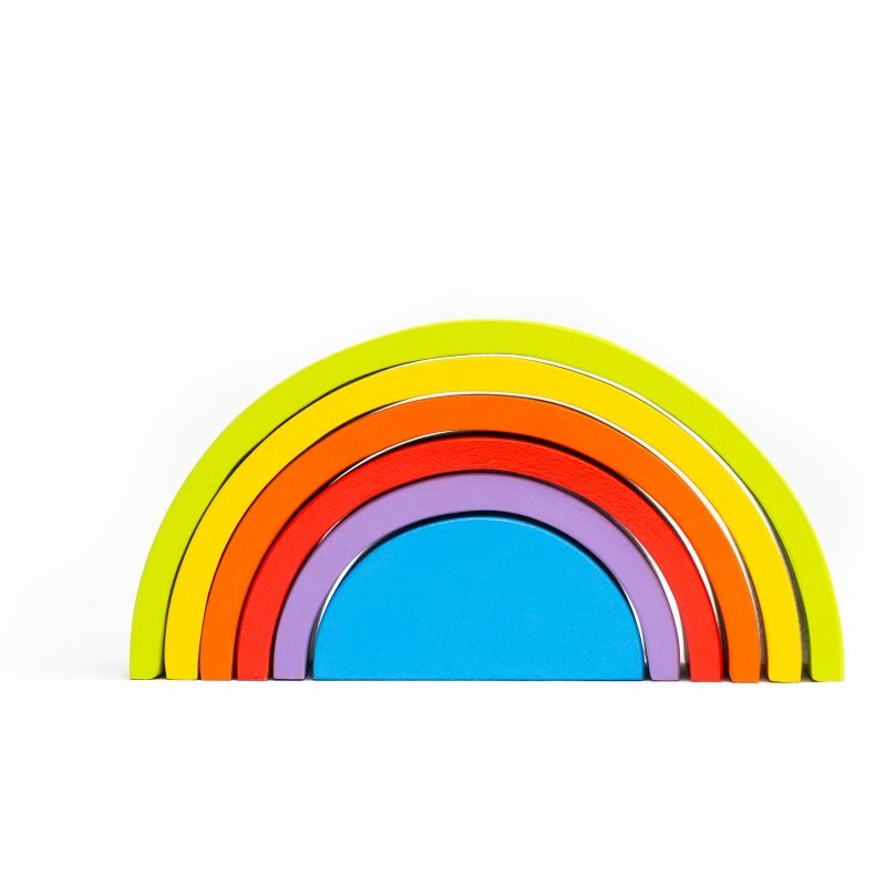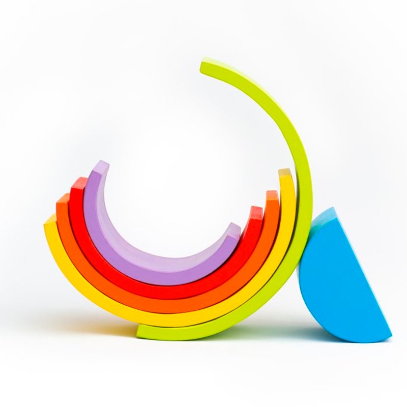 Y tantas otras cosas por descubrir con el ARCOÍRIS DE 6 PIEZAS. Sumergidos en la simpleza del arcoíris nos adentramos a un mundo mágico, descubriendo un amplio abanico de posibilidades por su gran versatilidad, dado que sus piezas pueden ser apiladas, ordenadas por tamaño, alineadas, y con ellas construir innumerables escenarios de mayor tamaño que recreen historias de la vida real (pueden ser puentes o túneles para los autos, torres, montañas, casas para los muñecos, laberintos de bolitas) fomentando el juego simbólico, la creatividad y la imaginación. Sus piezas pueden apoyarse desde diferentes bases otorgando la posibilidad de construir figuras tanto bi como tridimensionales, de gran altura o superficie. Fomenta la estimulación de funciones cognitivas como el uso de la lógica, la concentración, la atención, la resolución de problemas, presentándose desafíos de equilibrio y contrapesos en las construcciones. Es un producto tan versátil que se complejizará a medida que el niño crezca y desarrolle habilidades. Edad recomendada: +3
