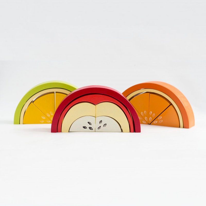 Bloques de construcción con características de frutas, estas ayudaran con la motricidad, distinción de colores, formas, tamañas, pesos. Edad recomendada: +3